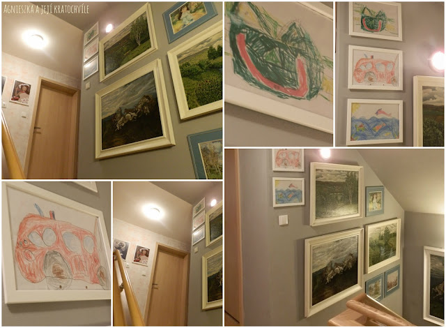 Při původním zavěšení obrazů nad schodištěm však plocha nebyla efektivně využita a celkově to bylo takové bez nápadu… S malováním nápad přišel a spolu s ním i plán postupně zaplnit plochu nad schodištěm i dalšími dílky, vč. těch, které vzešly z rukou našich dětí.