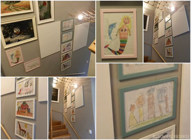 Původně jsem chtěla koupit nad schodiště pouze bílé rámečky, ale některé kresby Jiříčka jsou velmi jemné, výraznější barva rámečku jim bude slušet více a navíc pak nebude působit tak velké množství rámečků ve stejné barvě nudně – doplní je tak několik rámečků v pastelové růžové a světle tyrkysové.