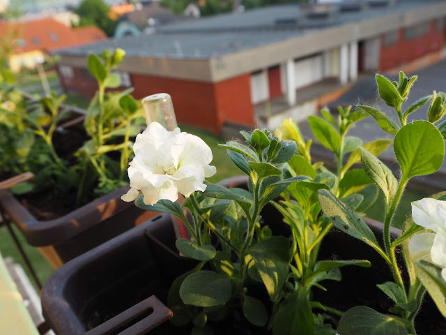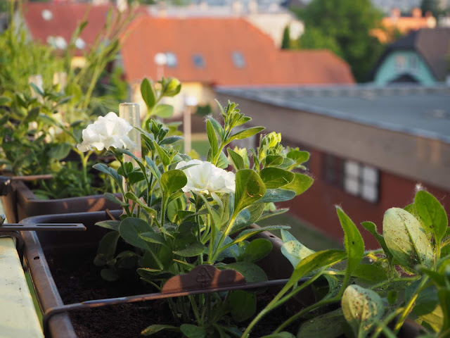 letos jsem do truhlíků koupila Surfinii převislou. Chtěla jsem jenom bílé květy a nic jiného bílého v Hornbachu neměli. Ale surfinii mám ráda, tak to nevadilo …