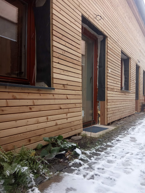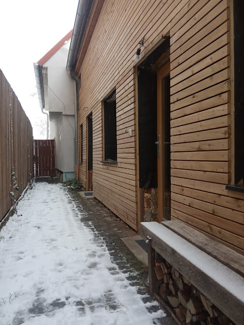 Muž letos stihl i chodník z kočičích hlav, které třicet let ležely nevyužité u našich na zahradě, fajnovou omítku a dřevěnou fasádu - chybí už jen špalety.