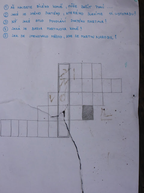 U hejkalího domečku nechal kůň zprávu s malovaným bludištěm a komiksem o svatém Martinovi. Že už prý teď jistě spí (ten kůň) a že se sem mají vrátit zítra po obědě. Taky chci spát až do oběda..